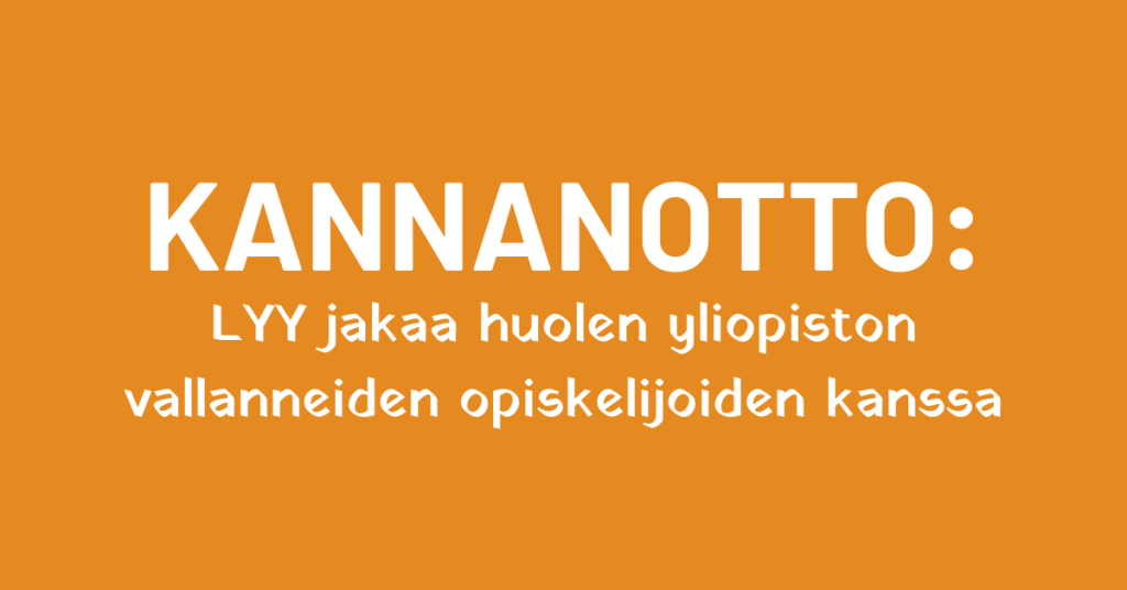 LYY jakaa huolen opiskelijoiden toimeentulosta ja vastustaa hallituksen budjettiriihessä vahvistettuja esityksiä asumistuen leikkaamisesta ja opintotuen indeksijäädytyksestä. Esitysten … [Lue lisää...] tietoaLYY jakaa huolen yliopiston vallanneiden opiskelijoiden kanssa liittyen toimeentuloon, kansainvälisten opiskelijoiden asemaan ja mielenterveyteen