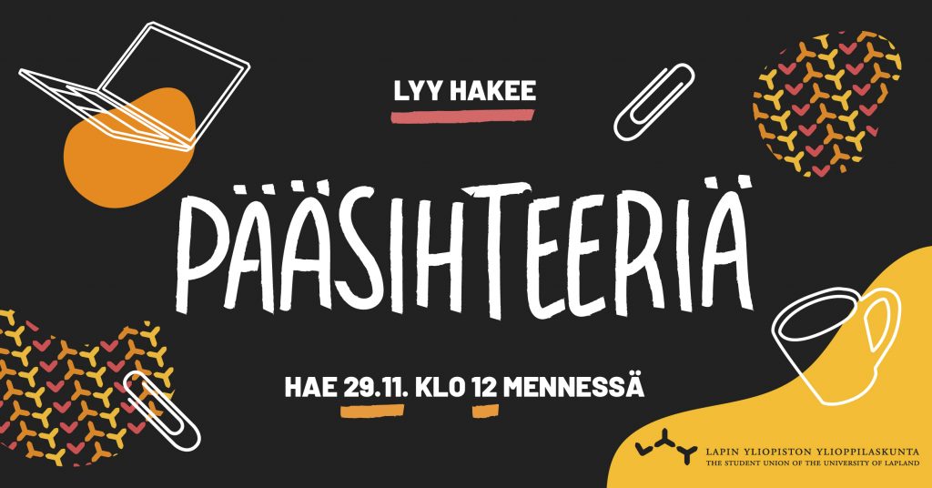 Lapin yliopiston ylioppilaskunnan (LYY) hallitus on avannut haun LYYn yhtiöiden hallituksiin kaudelle 2022–2023: Nyt haetaan kahta (2) opiskelijajäsentä Lapin Lyyli Oy:n hallitukseen ja yhtä (1) … [Lue lisää...] tietoaHae LYYn yhtiöiden hallituksiin kaudelle 2022–2023