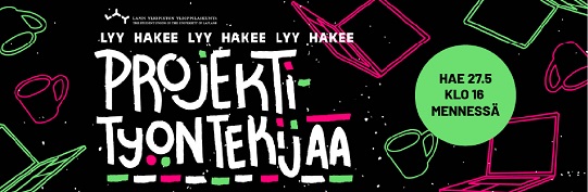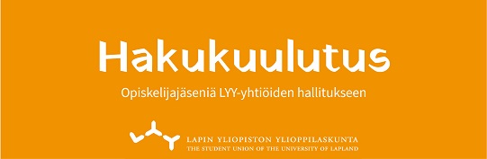 Lapin yliopiston ylioppilaskunta hakee projektityöntekijää ajalle 17.8. – 11.10.2020 Lapin yliopiston ylioppilaskunta on noin 3800 yliopisto-opiskelijan edunvalvonta- ja palveluorganisaatio. … [Lue lisää...] tietoaLYY hakee projektityöntekijää