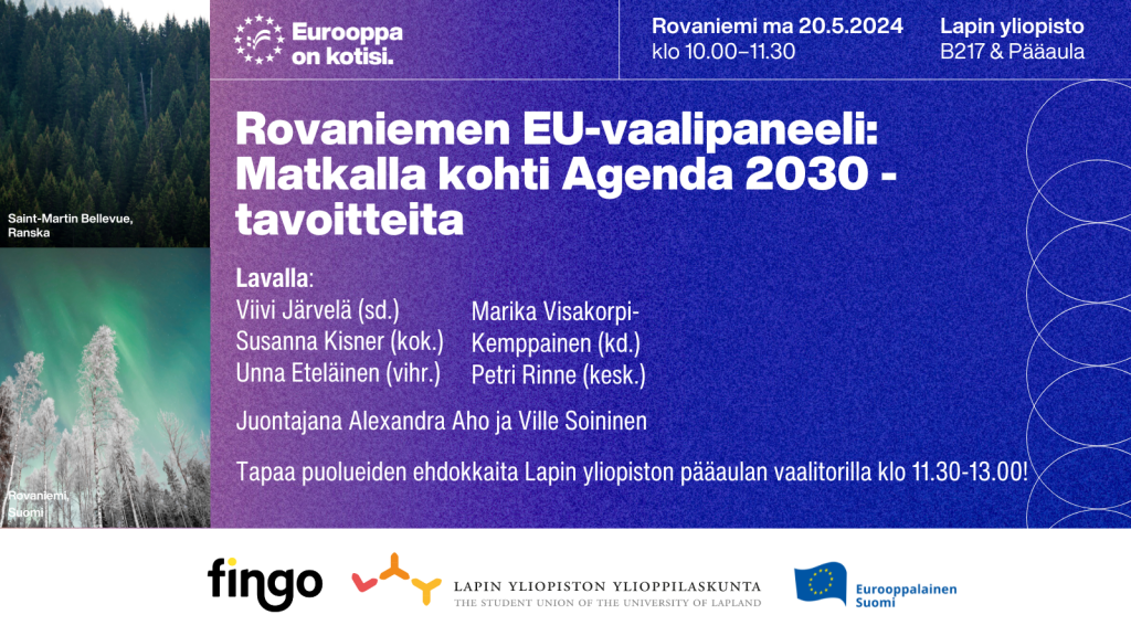 MEP candidates will participate in a panel discussion focusing on the European Union as an actor in sustainable development. How can the EU more strongly and consistently promote its own values in its … [Read more...] about The “Europe is Your Home” EU election tour arrives in Rovaniemi on May 20, 2024