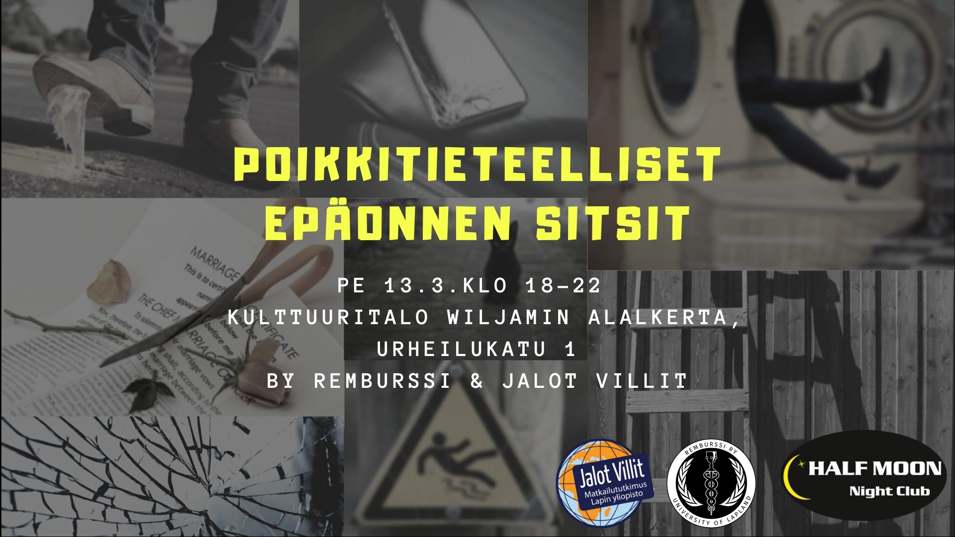 FI / ENG Oletko kaatanut kahvit päällesi juuri ennen työhaastattelua? Tuntuuko huono tuuri seuraavan sinua arpajaisista tenttikysymyksiin? Nyt on hyvä hetki kokoontua muiden epäonnisten kanssa juhlistamaan elämän heikkoja hetkiä! Perjantai 13. päivä on otollisin aika vetää koko homma päin honkia, joten kokoontukaamme yhdessä Remburssin ja Jalojen Villien kanssa viettämään ikimuistoista poikkitietteellistä sitsi-iltaa. Pukeutumisessa voit ottaa […]