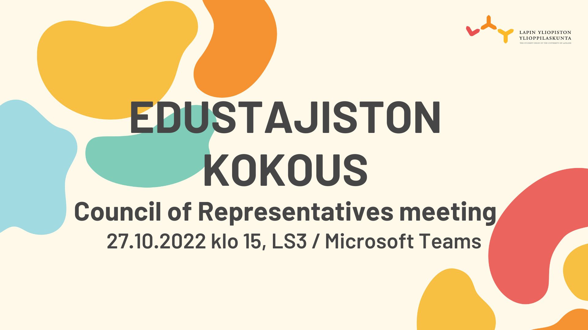 Tervetuloa LYYn edustajiston kokoukseen! suomi – english LYYn edustajisto kokoontuu torstaina 27.10. klo 15.00. Esityslista on nähtävillä asiakirjapankissa viimeistään viikkoa ennen kokousta. Esityslista: https://uusi.lyy.fi/asiakirjapankki/edustajisto/ LYYn jäsenet voivat osallistua kokoukseen sekä Lapin yliopiston luentosalissa LS3 että Microsoft Teams -palvelussa. Liity kokoukseen / Join the meeting tästä / here Welcome to the LYY Representative Council meeting! LYY's […]
