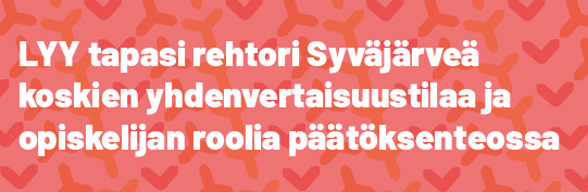 Lapin yliopiston ylioppilaskunta (LYY) tapasi Lapin yliopiston rehtoria Antti Syväjärveä perjantaina 23.10.2020 koskien LYYn aiemmin esille nostamaa tarvetta keskustelulle yliopiston yhdenvertaisuustilasta ja opiskelijan osuudesta yliopiston päätöksenteossa.