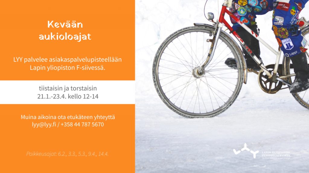 Keväthanget kimaltaa ja täällä me ollaan! Loman jälkeen rentouduttu ja jälleen valmiina arkeen. LYY palvelee asiakaspalvelupisteellään tiistaisin ja torstaisin kello 12-14. Huomioithan … [Lue lisää...] tietoaKevään aukioloajat