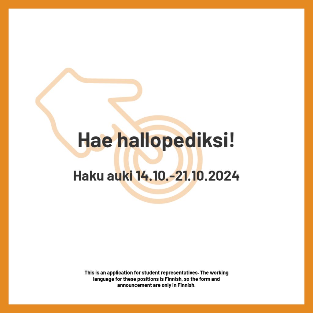 Tänä vuonna haettavaksi tulleet hallinnon opiskelijaedustajien, eli hallopedien paikat on saatu täytettyä. Tilanne on harvinainen, sillä täyttämistä varten pidettiin ainoastaan yksi lisähaku, ja … [Lue lisää...] tietoaKaikki 2025 vuoden hallinnon opiskelijaedustajapaikat täytettiin! Siis iso KIITOS!