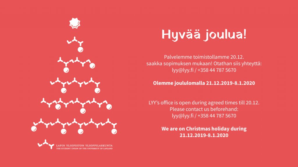 Enää alle kaksi viikkoa jouluun! Siispä tiedotusta pukkaa: LYY palvelee Ahkiomaantien toimistolla ainoastaan sopimuksen mukaan, eli mikäli on tarvetta asioida luonamme, soitathan tai laitathan … [Lue lisää...] tietoaJoulukuun aukioloajat