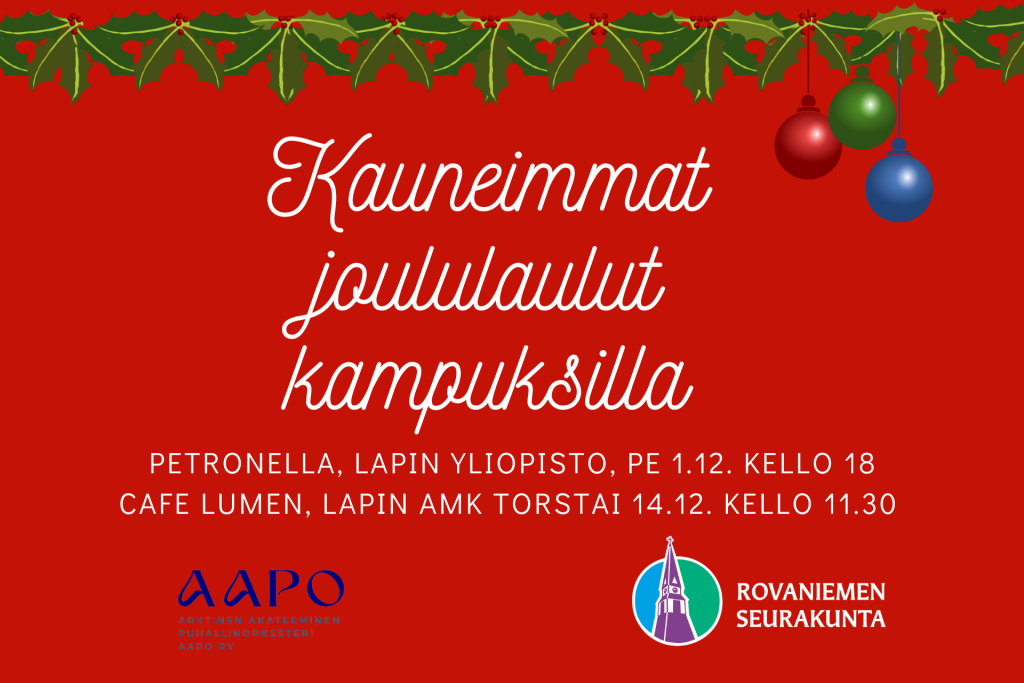 Tervetuloa laulamaan Kauneimpia joululauluja Rovaniemen korkeakoulujen kampuksille joulukuussa! Kauneimmat joululaulut kajahtavat Lapin yliopistolla ravintola Petronellassa perjantaina 1.12. kello 18 … [Lue lisää...] tietoaKauneimmat joululaulut kampuksilla 1.12. ja 14.12. / The Most Beautiful Christmas Carols on Campuses on December 1st and December 14th