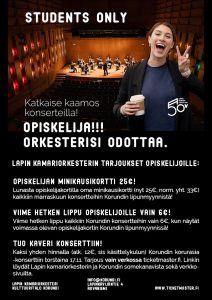 The last minute tickets are available to all Lapland Chamber Orchestra concerts at Korundi for students with a valid study card! Reclaim your affordable way to concert from Korundi ticket sale just before the venue (from one hour ’til few minutes before the concert). Please note that the offer is valid, if there’s vacancy.