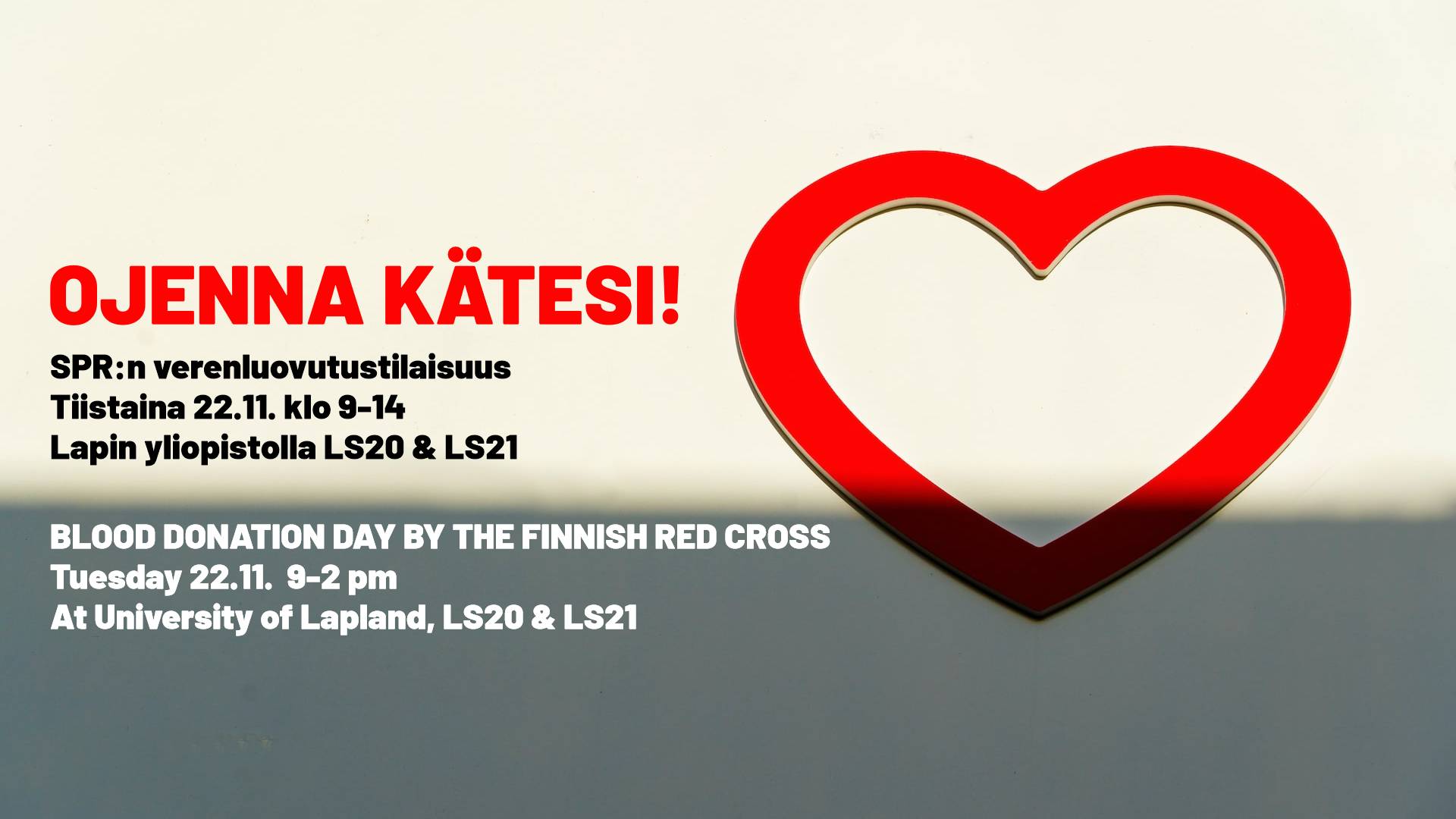 Now is an opportunity to help just by lying down for a while. The Blood Service of the Finnish Red Cross will organize a blood donation event at the University of Lapland held in the halls LS20 and LS21 on Tuesday, November 22nd from 9 am to 2 pm.